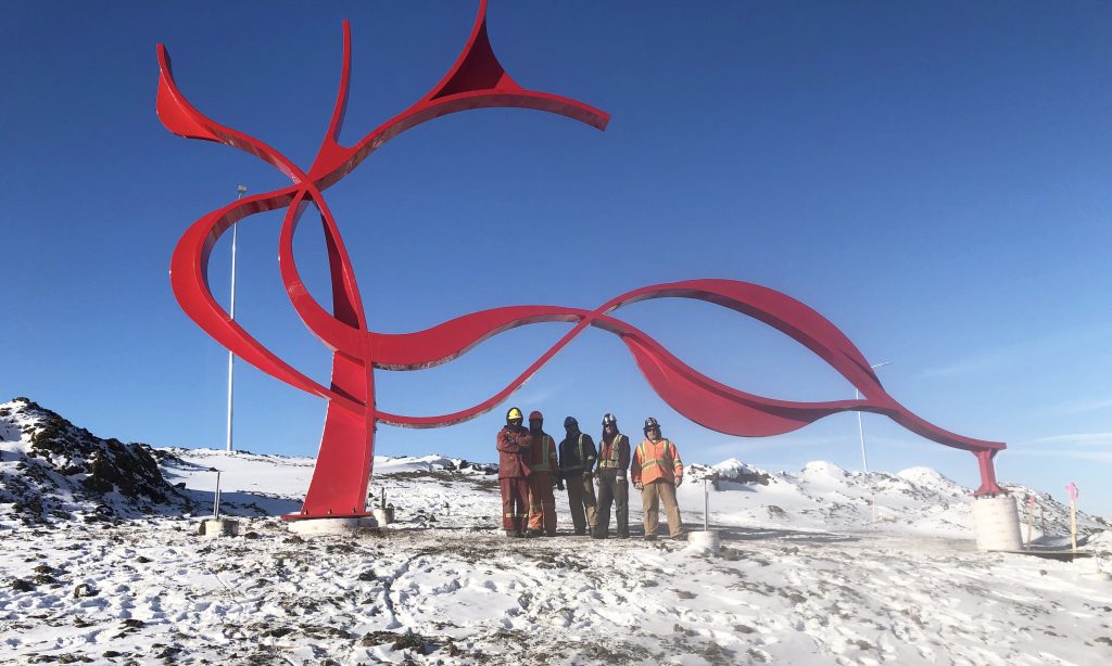 Constructed of illuminated Let-R-Edge letters mounted to horizontal steel rails. Powdercoated steel columns individually mounted behind the main structure with a height of 0.533 m (1.75 ft) and a width of 1.3 m (4.25 ft). The sign is front-lit via up lighting. Elk feature: Powdercoated steel structure built in three pieces with a height of 9.14 m (30 ft) and a width of 13.1 m (30 ft). The display is front-lit via up lighting. The scope of work included refining the provided design into a signage application and acting as a general contractor on site; supplying concrete, electrical (including pulling power), engineering, lighting, and all signage elements.