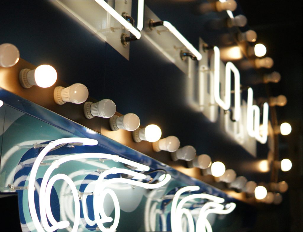 A mix of aluminum and steel construction and digitally printed decorative elements topped with custom hand-bent neon scroll work and letters. The signs are lined with white chasing light-emitting diode (LED) bulbs adding movement that complements the sign’s unique shape.